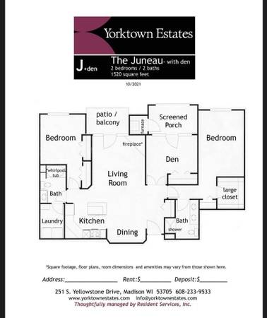 Unit is 1520 sqft w/ lots of storage space. There is a patio and a screened in porch. The unit is listed on Yorktown Estate’s website as 2 bed 2 bath plus den, but the den is quite large and has a closet. It can easily fit a bed plus furniture, previous tenants were using it as a bedroom. In-unit washer dryer and gas fireplace. Indoor heated parking available with unit! 1st floor unit!!!! The unit layout is called “The Juneau”. $2577 per month rent. Rent includes parking, water, sewage, and garbage.