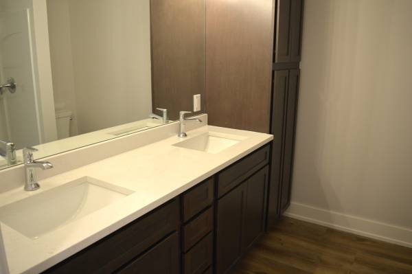 The master suite is a peaceful retreat with a private bath that includes dual vanities, a walk-in shower, and a generous walk-in closet. Two bedrooms, a full bathroom, and the laundry room complete this unit.