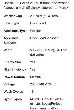 Bosch compact front load washer 800 series 240V includes plug in accessory to plug into a 4 prong dryer outlet. model#WAT28402UC Energy Star, excellent condition $400/OR BEST OFFERCash and pick up...