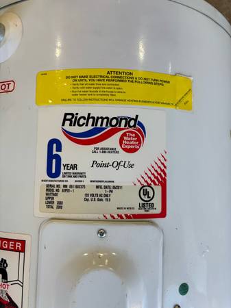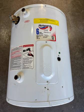 Richmond water heater. 20 gallon. 120 volt. Only used for one year, then pulled out for a bigger one. Just installed new heating element. And flushed. It’s like new condition. What works great for a cottage or a shop. Been sitting in storage and need to move.