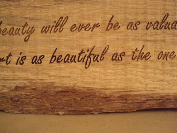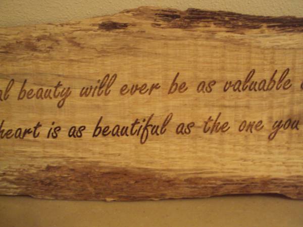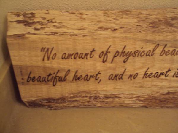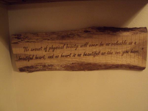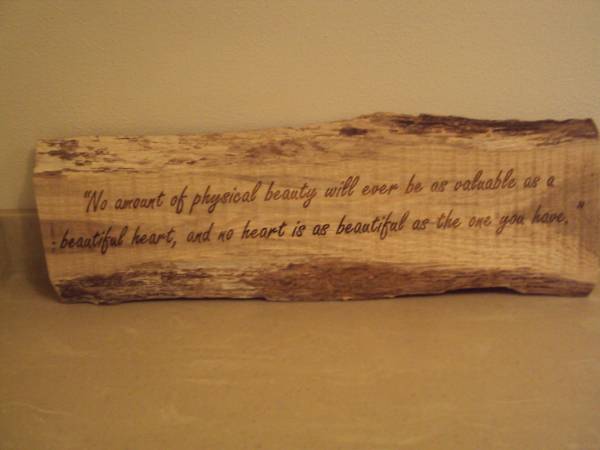 Like new beautiful decorative driftwood wall hanging plaque with verse. "No amount of physical beauty will ever be as valuable as a beautiful heart, and no heart is as beautiful as the one you have". Measures 24"W x 8"H x 1"D. Ready to hang. Like new condition. Smoke and pet free home. $10.00. Call 608-seven-9-8-four-7-three-6 or email anytime. Can arrange to meet to pick up.