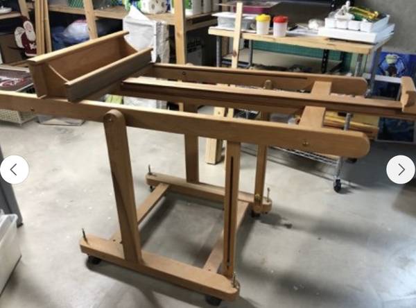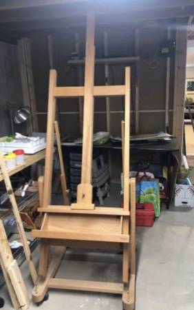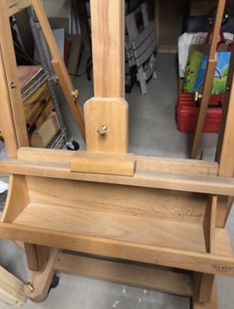 Easel accepts both vertically and horizontally positioned canvases. Easel can be locked in any position between vertical and horizontal, allowing greater flexibility while painting. The easel’s sturdy base has four lockable casters and is fitted with a storage area below the canvas ledge for tools, brushes, and paints. The M-18 easel measures 147½"H × 26½"W × 29½"D. It weighs 52 lb.