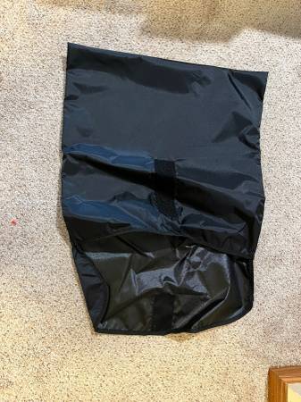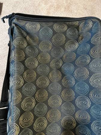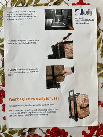 XL bluefig sewing machine tote with 2 sets of wheels. The tote is large enough for big machines and it can be collapsed. Used once, like new. It has pockets and a separate bag to carry supplies. Black circular print fabric.