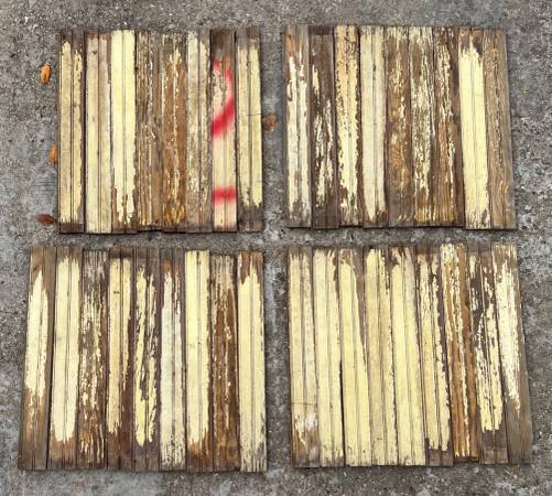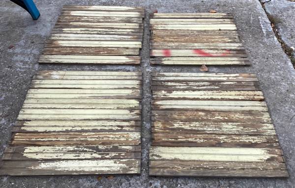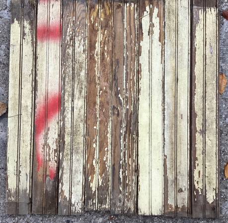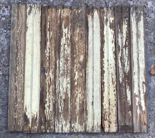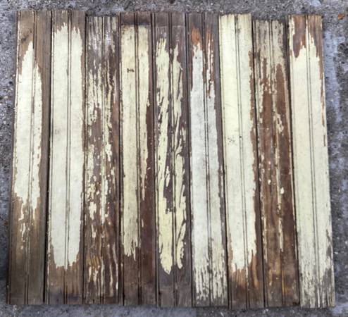 Antique wainscoating. Old, chipped paint, worn with various scratches as something this aged is expected to look. Came out of an 1880’s North Freedom farmhouse (see photo).