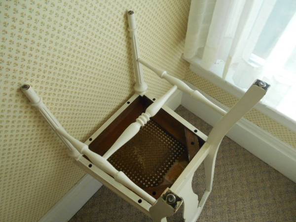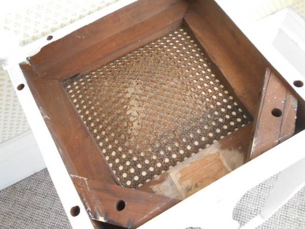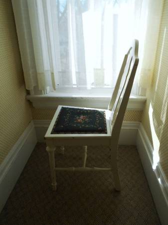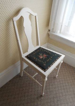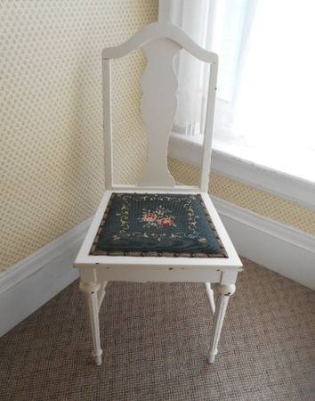 Offering an wonderful ANTIQUE Dalion Mfg of Milwaukee chair. Sturdy construction, no wobble. The pics of the bottom are just to show the original metal feet are intact, and that the original caning wore out so the fabric pad was put on. The chair is glossy white paint over the original finish. Paint could be easily touched up if desired. Beautiful woodwork! Chair measures 14.5" Deep x 16" Wide (at seat's edge) x 3' High (at backrest). The seat is about 17" off the ground. Beautiful solo chair great for office, changing in the bedroom, putting shoes on in the hallway, etc. Non-scuff metal feet are original and the seat tapestry/needlepoint work is VERY CLEAN.