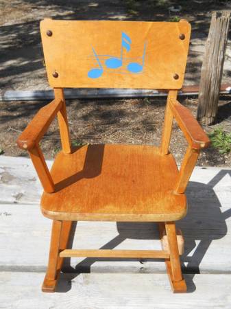 Offering an Antique Child's Musical Rocking Chair in good, working condition. As a child rocks back and forth it triggers a small music box mounted on one of the chair rockers. The musical box is tan with several small rust spots, but the rubber foot on the box is in great shape yet. There is are musical notes painted on the chair backrest. It measures 22 in High x 13 in Wide x 18 1/2 in Long or Deep. The chair shows typical wear for its age and from use.