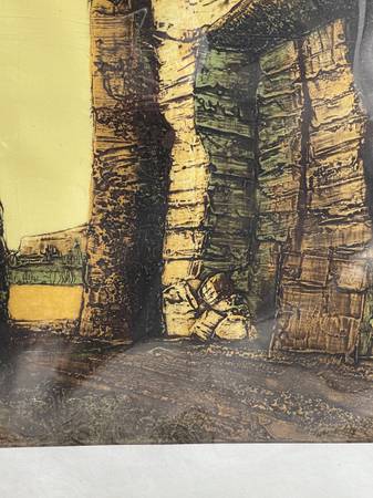 This striking piece features Meeker’s signature textural style and rich earth tones with a bold yellow sky, depicting architectural forms and natural elements. Perfect for collectors of mid-century modern art or those seeking a dramatic statement piece.