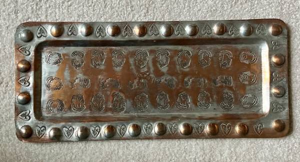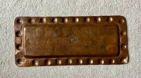 This Egyptian engraved copper tray is a beautiful piece of metalware that will make a great addition to any collection. The tray is handmade and crafted with intricate engravings that showcase the rich history and culture of Egypt. Made from high-quality copper, this tray is durable and will last for years to come. Its unique design and stunning appearance make it a must-have for collectors and enthusiasts alike. It measures approx 12 " x 7 3/4"