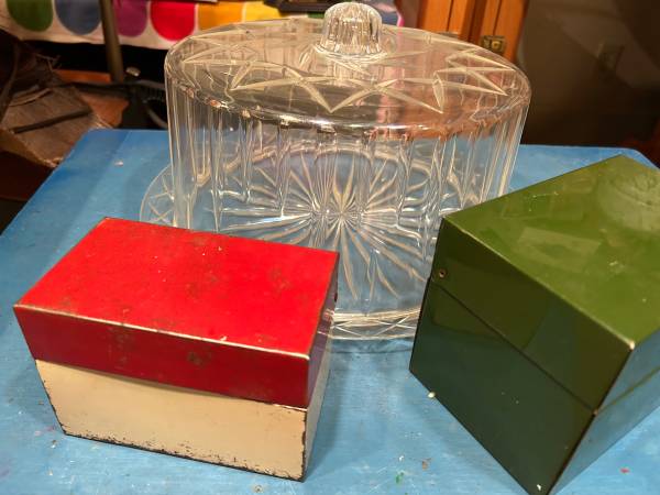 Fun vintage kitchen pieces— Lucite cake saver with cover—perfect condition Red/white metal recipe box and green metal recipe box, both with recipe card dividers (used but good condition) Better...