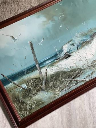 Vintage Seascape Beach Scene Oil Painting – Framed – 39.5” x 27.5”