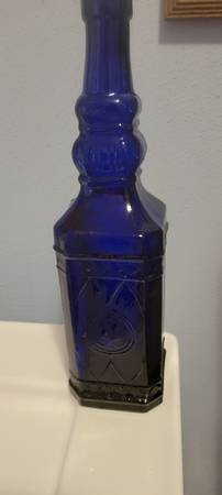 14 cobalt tea cups in mint condition. No chips or cracks. $20. COBALT Apothecary bottle. No chips or cracks. Bottom of the bottle indicates made in Spain. Cash only please. $20