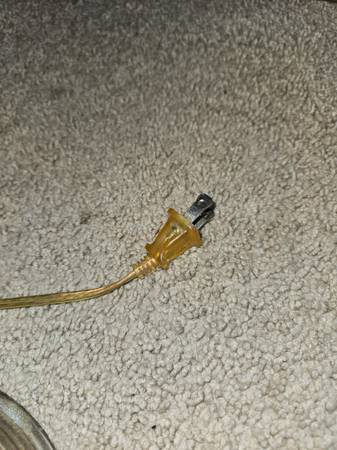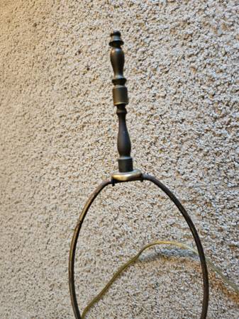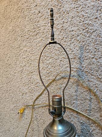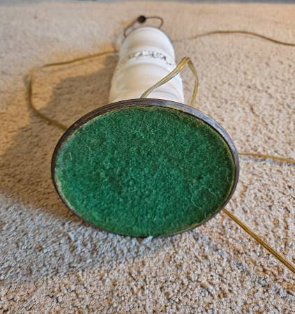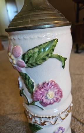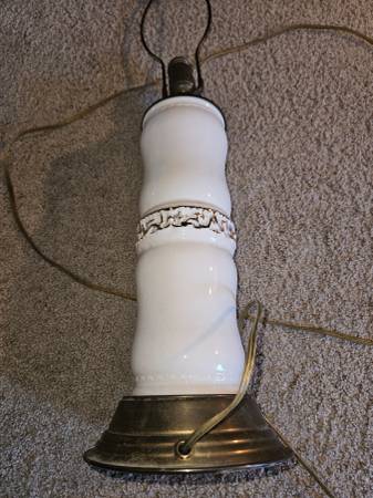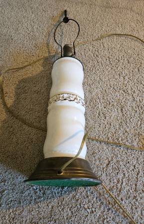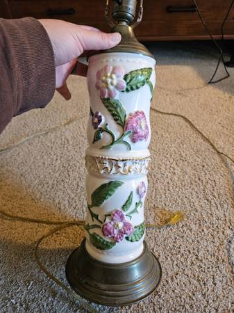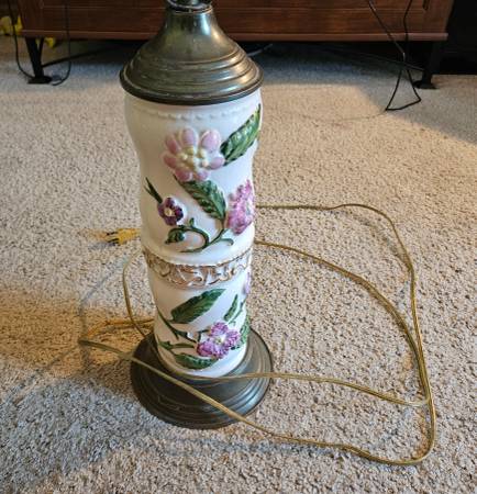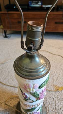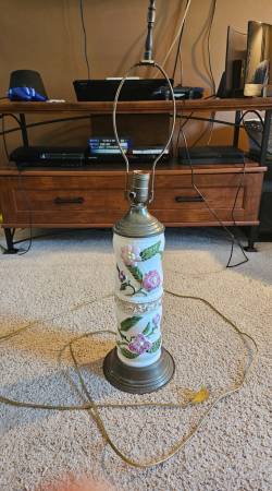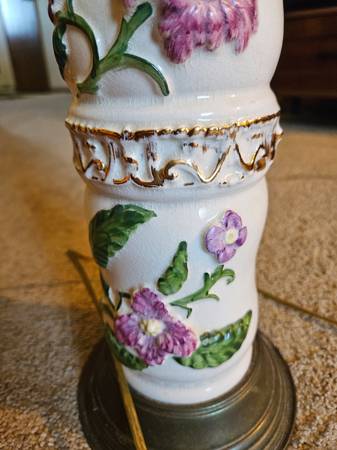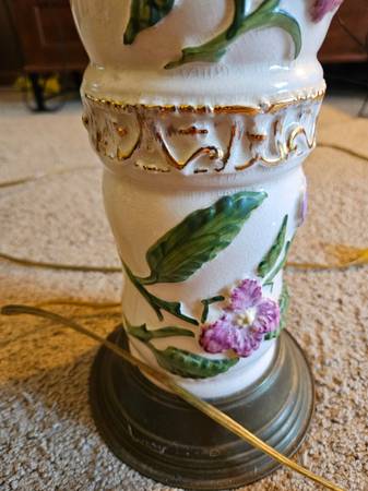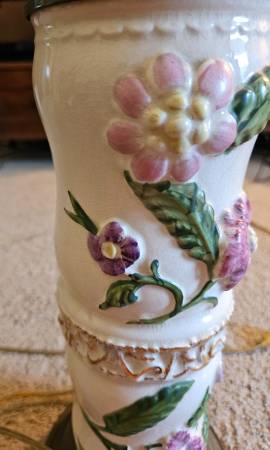 This is an antique ceramic lamp, it is rather old and the lamp is in excellent condition, like new. The lamp has is ceramic and it's white with gold accents, purple and pink flowers with green leaves and stems that are all raised. It is metal on the top and bottom with a green felt base bottom. The lamp is an electric plug in and it works great. The lamp is 29 inches tall and the base is 6.5 inches round.