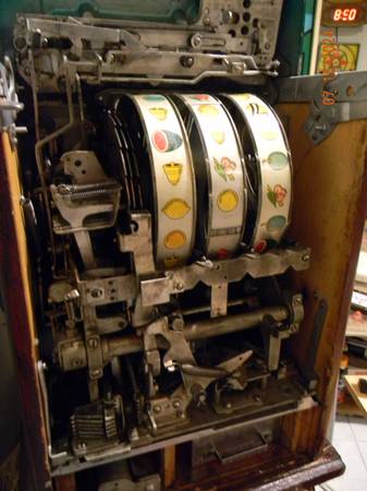 This 1940's Mills Slot machine it is the 777 Special in a nickel denomination, it has been repainted. All original with key for back door and original sticker and owners instructions on inside backdoor. This is a mechanical machine (not Electrical) easy to work on and works smoothly.