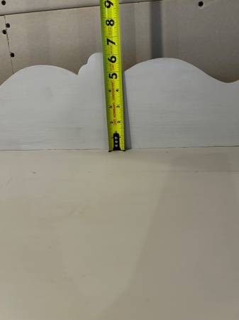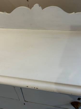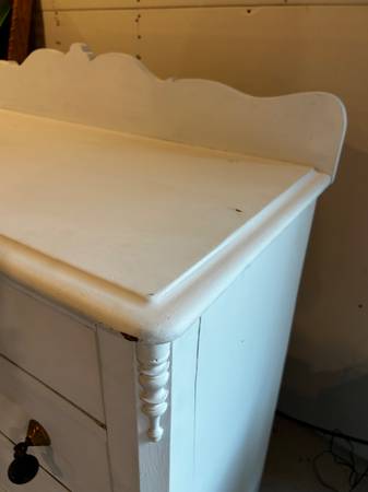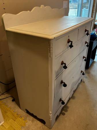 Solid wood dresser, most likely walnut (see drawer photo). Chalk painted. Five dove-tailed drawers indicate a very well constructed piece of furniture. Cracks and distressed spots enhance the antique nature of the piece. Brass (or similar) swinging metal drawer pulls, unique wooden ornamentation in corners of the dresser. Dimensions in photos.