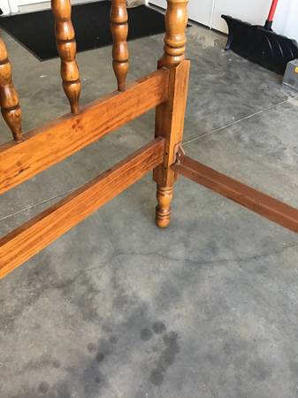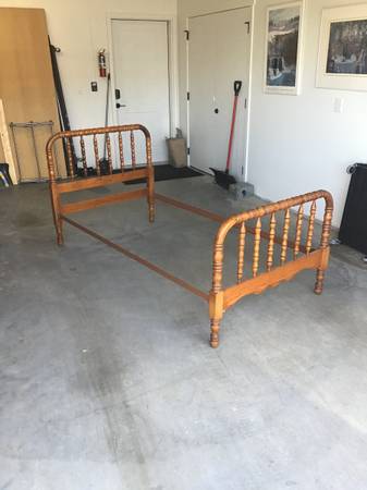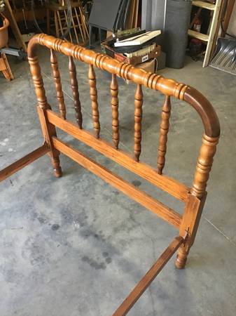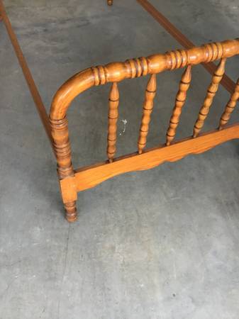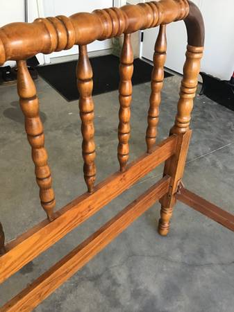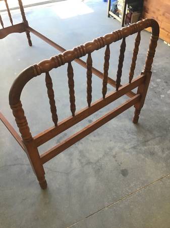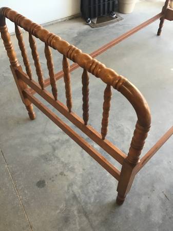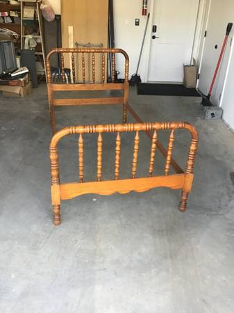 Matching set of two Antique Twin Spindle Beds (Jenny Lind). The outer dimensions of the beds are 81” x 41.5”. The headboard is 39" tall. The footboard is 30.75" tall. The space for the matress is 76” long by 39.25” wide and fits a standard twin mattress.