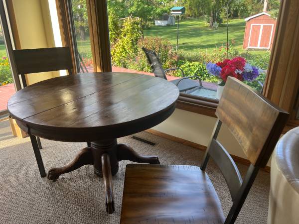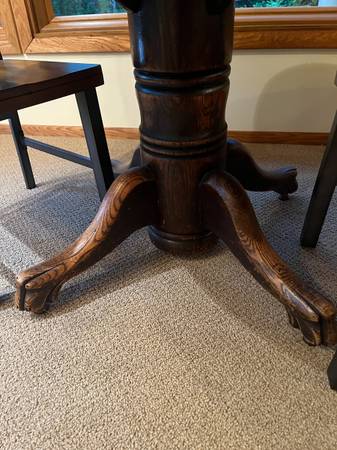 Antique claw foot table that has not been refinished and has 4 leaves - $150 4 NON-Antique chairs $50/chair Will sell together or separately. Cash only