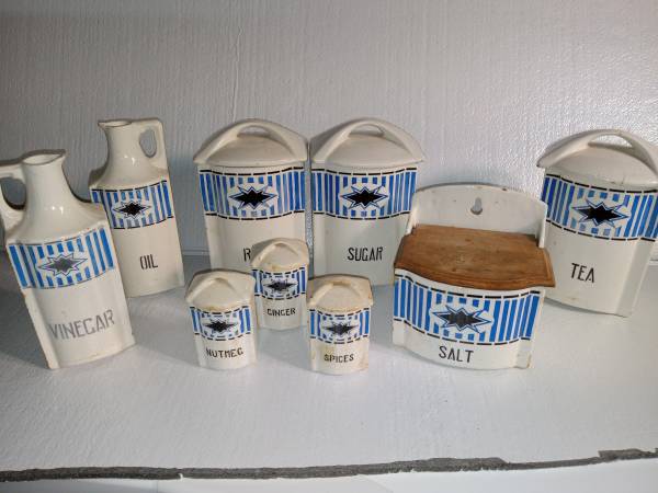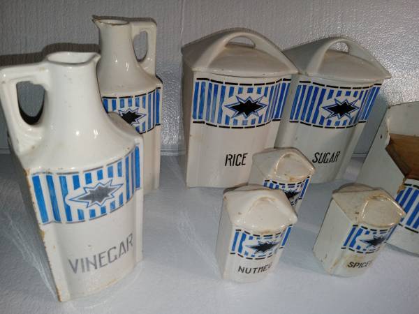 100-year-old 30 piece set of Czechoslovakian canisters with vinegar and oil dispensers. Only half of the set is shown. Includes a total of 6 large 8" tall canisters with lids, 6 small 4" canisters with lids and the oil and vinegar dispensers. All pieces show their age with some crazing and cracking, but overall in pretty decent shape. $35 for all.