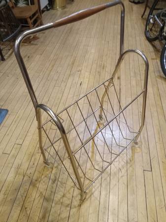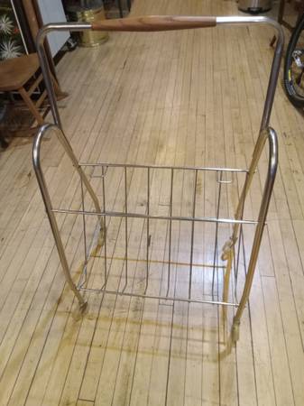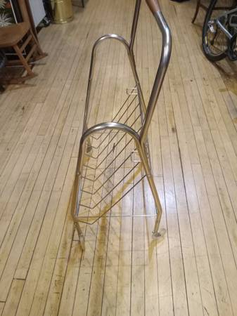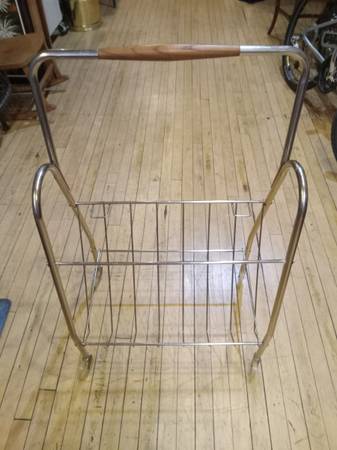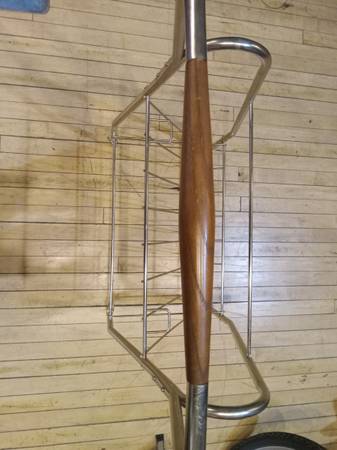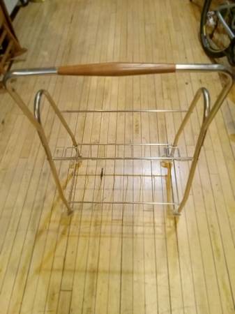 Mid century modern metal and wood cart with 4 swivel casters. Gold tone metal with wood handle. 24" wide x 37" high x 15" deep. $30.