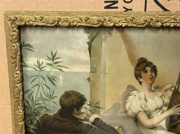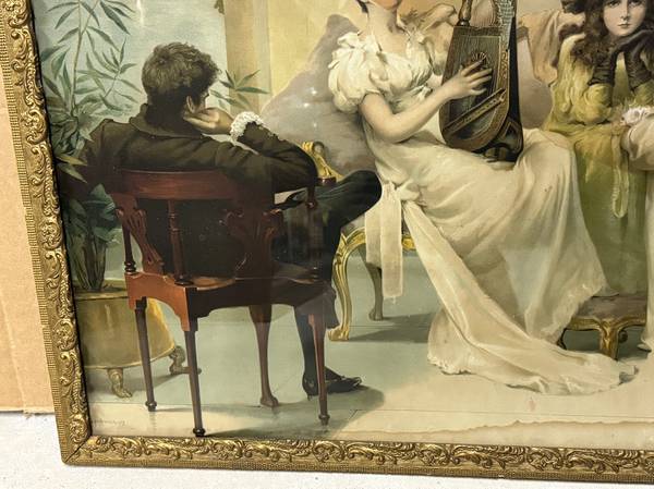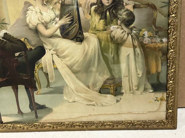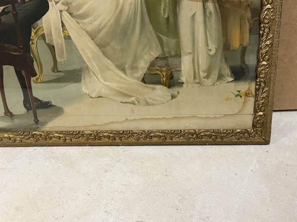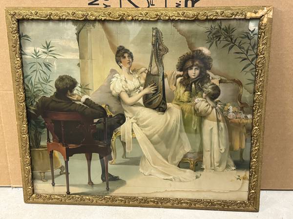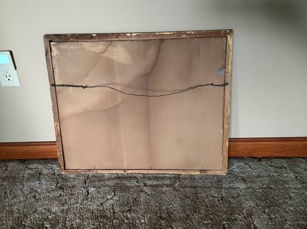 This is very old and has some water damage. The frame has started to deteriorate in a couple places. The scraps or pieces to repair the frame have been saved if you want to restore it. Overall it still looks good and looks it’s age. In Wisconsin Rapids.