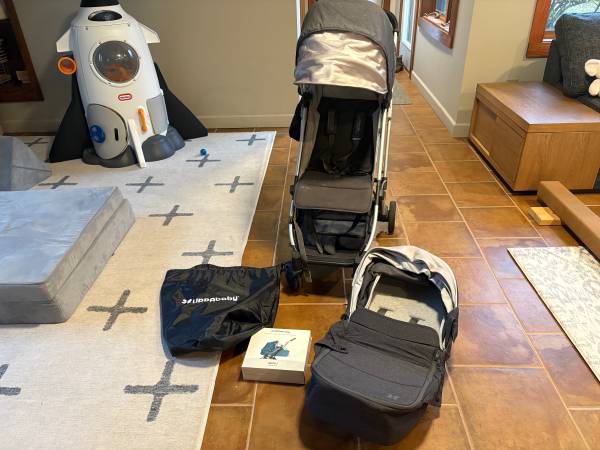 UPPAbaby Minu stroller with the above accessories include the bassinet (from birth kit), ride board, and rain cover