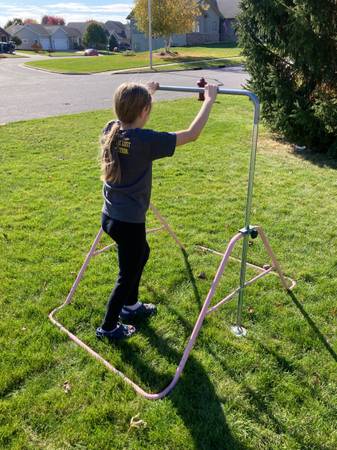Children's metal Gymnastics Bar for indoor/outdoor use. Gently-used exercise gym equipment that's adjustable & foldable. Pick up in Sauk Prairie.