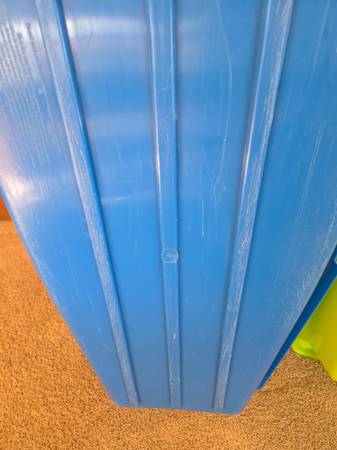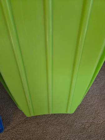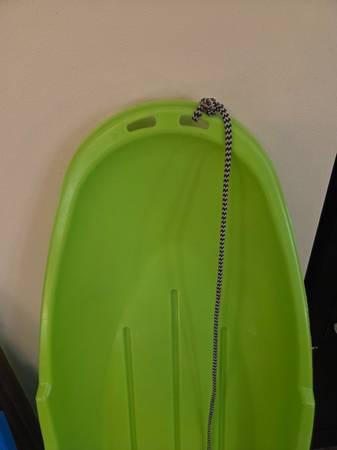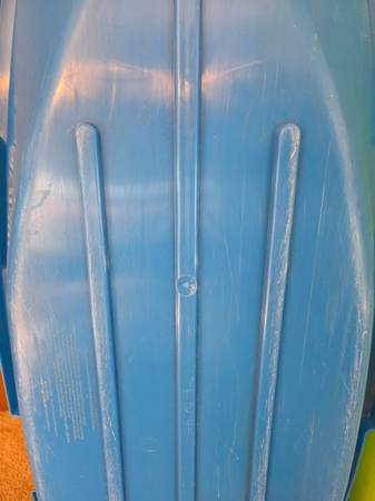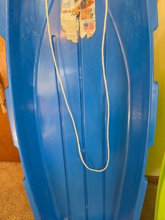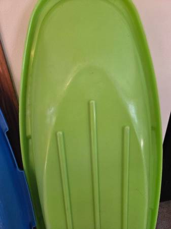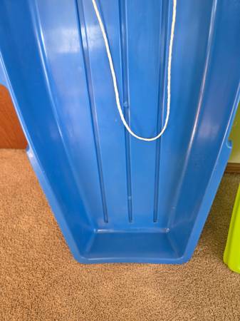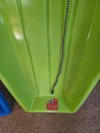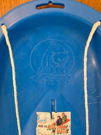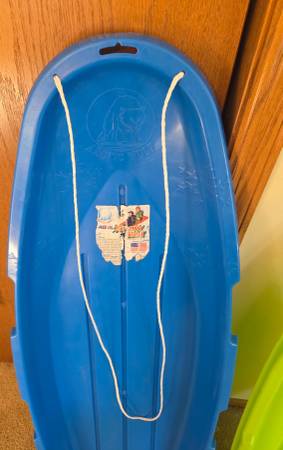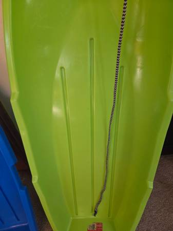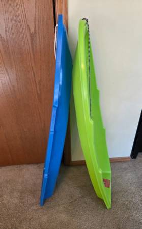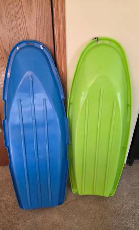Both are used but in excellent condition, they just have some scuff marks from being dragged on the back side of the sleds. There are no breaks or cracks. Both come with pull strings, the green sleds string does need to be tied back on and it's frayed at the end but that's an easy fix. They are made of sturdy durable plastic. There is a blue sled by Artic Wolf and one light green sled. I'm not sure what brand the green sled is. They are 48" long and about "17 wide, at the widest part. 1 to 2 seaters depending on the size of the riders.