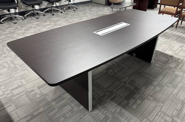 This conference table features gentle curves on the longest edges and is finished in dark Espresso. There is slight damage on one of the legs, with coloring around the holes to help mask it at a distance. Overall measurements are 93" x 36/42" x 29".