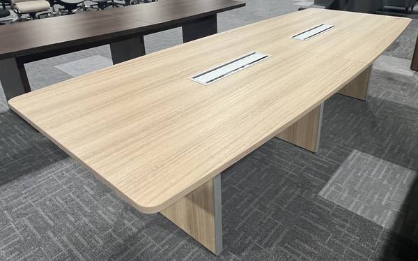 This conference table bows out at the sides for a modern profile. Inside the central grommet is a power module for charging mobile devices and projectors. Overall measurements are 120" x 48" x 30".