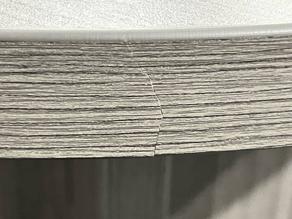 This table measures three feet wide and is made with commercial-grade laminate construction for the tabletop and the base. There is one crack in the outer trim, adding a discount to our already-low price.
