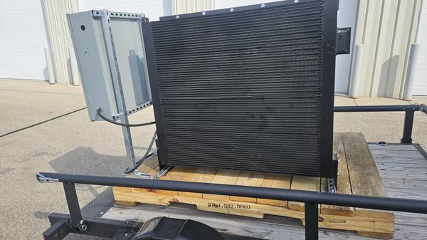 Oil cooler mounted on a sturdy wooden pallet with 24"x30" VFD enclosure mounted to pallet. 10HP motor. Unit previously had mineral oil run through it and was not cleaned/washed out. Available for pickup, and I can load with a forklift. Pallet dimensions are 52"W x 73"L. Buyer is responsible for securing to truck/trailer.