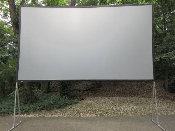 Details: Draper Cinefold Ultimate Folding Frame, Projection Screen, hardware, soft bag for screen, all in Draper shipping case. Screen measures 225" or 15.4' diagonal, 112" x 196" or 9.3'x16.3'. Stand can hold screen 12' up! Sturdy with 42" wide legs with heavy-duty angle support. Screen is super bright at dusk and night. Looks like front and rear projection, or just turn it around. Screen is very good condition, newer grey style, supple, some minor creases and spots. A new projection system this size will cost $4200 with 5-6 week lead time