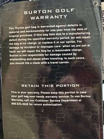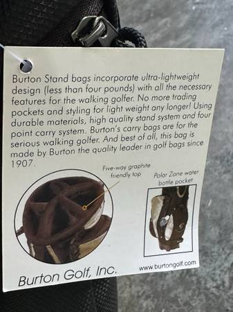 Burton Stand bags incorporate ultra-lightweight design (Less than 4 pounds) with all the necessary features for the walking golfer. No more trading pockets and styling for light weight any longer. Using durable materials, high quality stand system and four-point carry system. Burton's carry bag is for the serious walking golfer. Best of all, this bag is made by Burton the quality leader in golf bags since 1907. Price is picked up.