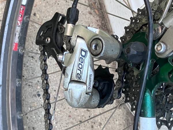 3x9 drivetrain w/ Shimano Sora brifters, Deore rear derailleur, Microshift front derailleur, Truvativ 175mm crankset with 30,42,52T chainrings, and an 11-34T cassette in rear. Tektro Mini-V brakes in front and Shimano V brakes in rear with a Problem Solvers Travel Agent cable pull ratio converter. Cane Creek Crosstop levers. Hand built 36 spoke wheel set. Front is a Son28 generator hub laced to a DT Swiss TH540 rim. Rear is a Deore LX hub laced to a matching TH540. Both are wearing Schwalbe Marathon Supremes. Shimano PD-A530 pedals. Ergon touring saddle. Full coverage Planet Bike fenders. Front and rear Tubus touring racks. Front and rear Busch & Mueller lights w/ a TOPLIGHT Line brake plus in rear and an IQ-X in front. It even has two extra spokes on the chainstay. With a strong and comfortable steel frame and all the top of the line accessories you could want this bike is ready for that long distance tour you’ve been dreaming of!