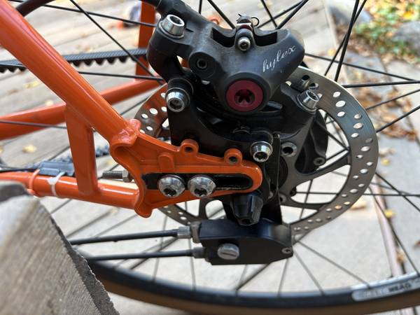 The bike:Note: WTB tires and leather saddle have been installed (see last 4 photos). The shifter required special road handlebars that are assembled in 3 pieces. The hub was professionally laced to 700c rims. The Soma Wolverine frame is specially designed for belt drives with a break in the right seat stay to allow the carbon belt to be installed. Wolverine allows for wider gravel tires. The disc brakes are hydraulic and are very smooth.