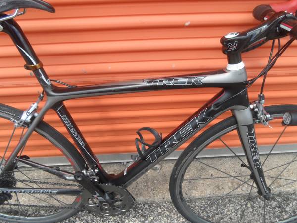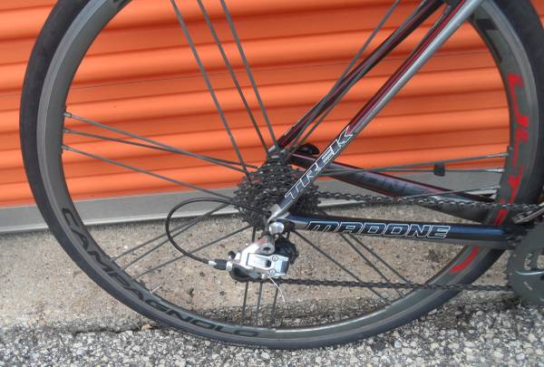 TREK MADONE: A light weight full carbon (frame/fork/seat post/crank arms/hubs/stem/handlebars) TREK Madone OCLV carbon asymmetric design. 18 inch/45.7 cm c-t, (slight sloping top tube so about a standard 19/20 inch/48-50.8 cm) frame. Extended seatpost thus pedal to top of seat distance varies from 32” min. to 36” max.. Campangolo Shamal Ultra wheels with Continental Grand Prix 4000SII 700c x25 tires and carbon QR hubs, presta valves. Front Wheel: 16 radial laced flat spokes. Rear Wheel: 27 radial laced flat spokes (paired 2 drive side/1 non drive side). FSA carbon stem/6 degree rise and FSA K-force monocoque compact carbon handle bars w/Planet Bike HB tape. Sram Red components. Dura Ace bolt on front derailleur. Bontrager water bottle cage. Selle SMP Stratos split seat. Internal cable routing. Integrated Blue Tooth Smart Duotrap Bontrager sensor. Sram Power Glide 10x2 drive with 172.5 mm cranks, 50/34 chain rings, chain, and cassette 11-12-13-14-15-17-19-22-25-28. Used, still in excellent/very good shape. Excellent value, priced to sell.