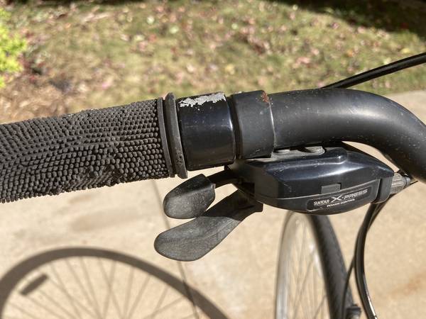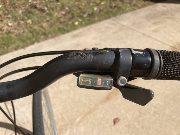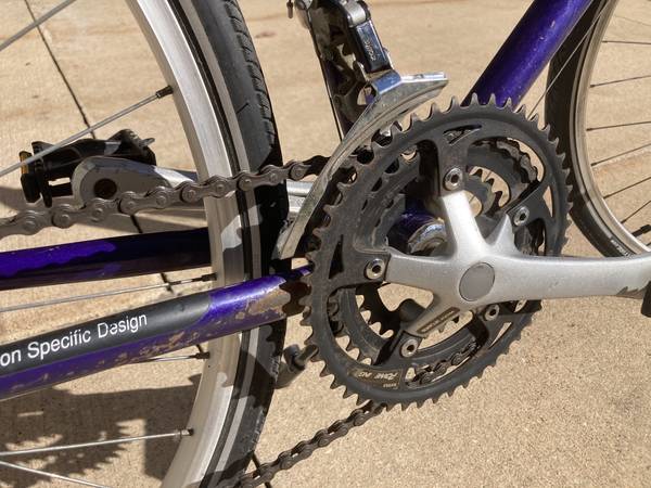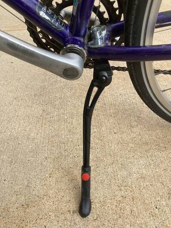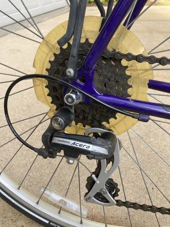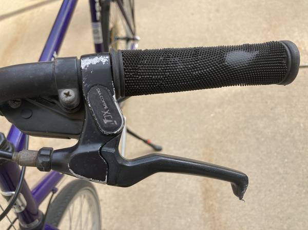 For sale is my 1-owner Trek 720 Multi-Track bike that was bought brand new in 1991. It's purple in color with a Cro-moly 23" frame. Made in Taiwan. 700 x 35C Kenda tires. 21 speed (7x3). WTB seat, water holder, rear bike rack & new kickstand. Everything works. Original wheels & gear set. I've rode many miles on this bike and, although it shows some wear & tear (see photos), still rides well and is well balanced. Note that the right-side shifter is not original and the plastic spoke guard on the rear wheel should be replaced. Included with the sale is the original Trek owners manual that came with it when new.