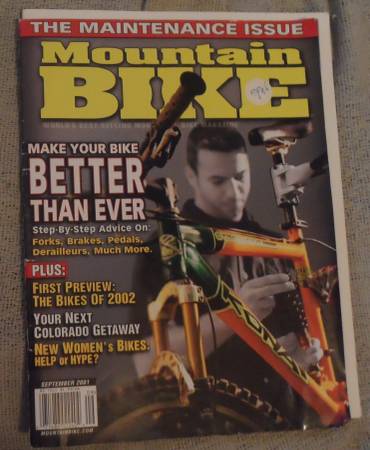 MOUNTAIN BIKE MAGAZINE: The Maintenance Issue. Make your bike better than ever. Step-by-Step advice on: Forks, Brakes, Pedals, Derailleurs, and much more. September 2001 issue. $1.