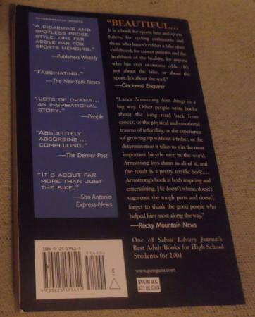 LANCE ARMSTRONG, It's not about the bike, My Journey back to life. Lance Armstrong with Sally Jenkins, 289 pages, 6x9 x3/4 inch, Berkley Publishing Group/Penguin Putnm Inc., ISBN 0-425-17961-3, New, Sell $5.