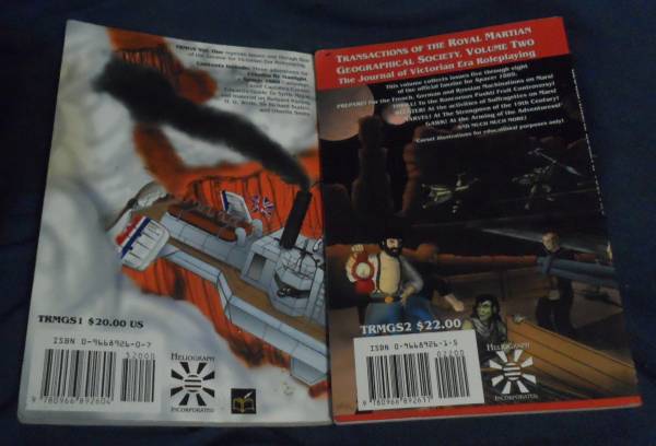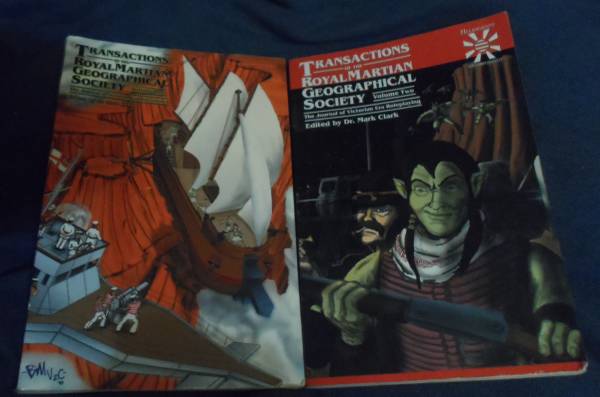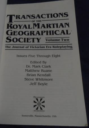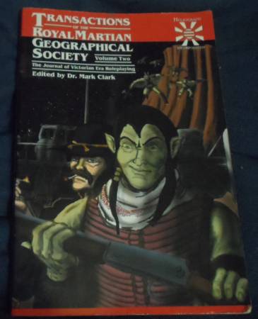 Transactions of the Royal Martian Geographical Society, The Journal of Victorian Era Roleplaying. Edited by Dr. Mark Clark. Volume One, Heliograph Incorporated, Paperback Book 196 pages, ISBN 0-9668926-0-7. NR 20.00.