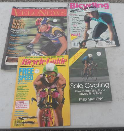 Includes information on cycling for triathletes. Covers the basics, training, racing, the mind, body, and the bike of Solo Cycling/Time Trials. Also get a Velo News, Bicycle Guide and a Bicycling magazine with an articles on Time Trialing.