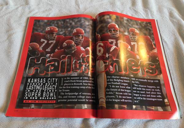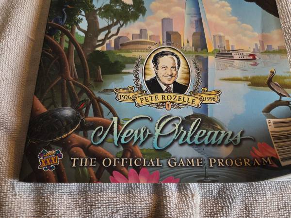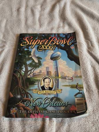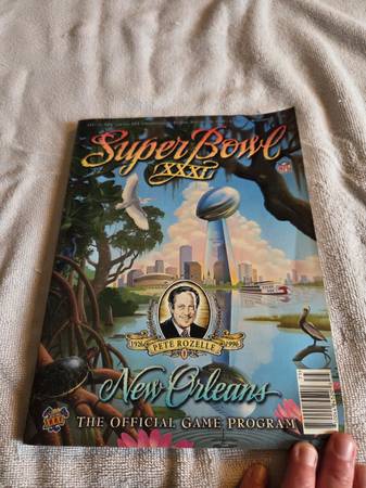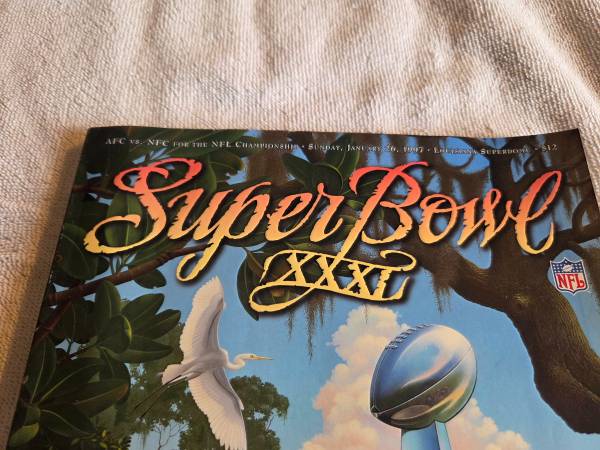 Gently used and in great condition, just packed away and stored. No tears, writing, rips, or missing pages. The bottom right side corner is bent upwards, so the edges of the book and pages are bent. Otherwise it's in excellent condition. This is the official game program for Super Bowl XXXI at the Super Dome in New Orleans. The Green Bay Packers vs the New England Patriots. Sunday, January 26th 1997. The Packers won 35 to 21.