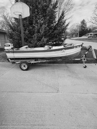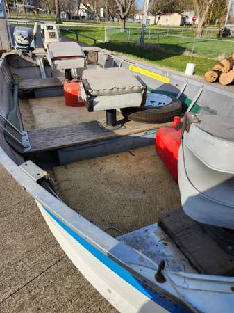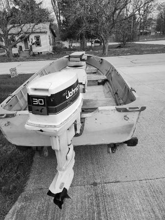 30 hp Johnson motor, Seamaid 14' aluminum boat n trailer. Plywood floors with carpet. Tilt trailer. 6 gal gas tank, hose, anchor, oars, 3 swivel seats, motor lock, spare tire n rim. Great fishing boat and pulling water skiers. Also included, a set of waterskis, tow rope, knee board and floating attachment for behind motor. OBO