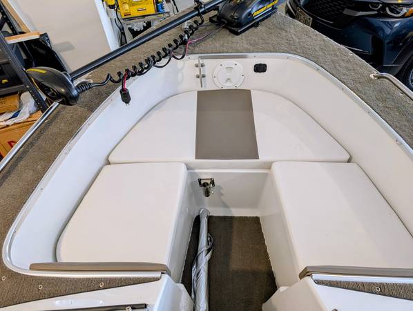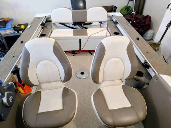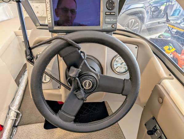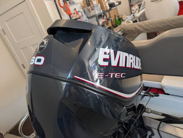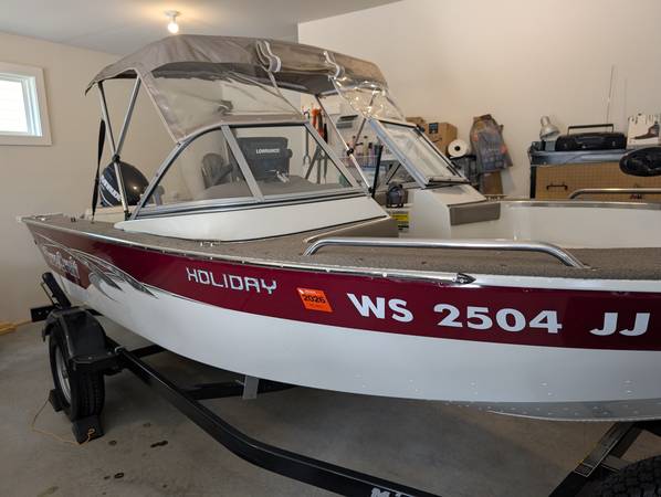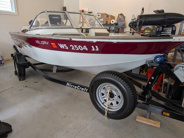 Mirrocraft Holiday 16 ft Aluminum boat for sale. 60 HP Evinrude E-tec and matching Mirrocraft trailer. Only 61.7 hours. Boat and motor are just like new. Many extras including Minkota trolling motor, trolling plate, Lowrance GPS/Finder, Bimini top and full custom boat cover, spare tire, etc. The trailer also has a hinged tongue for easy storage, and LED trailer lights. This boat is very clean and ready to go!