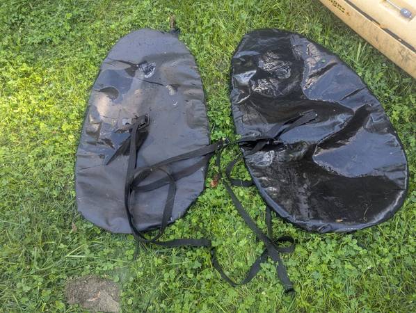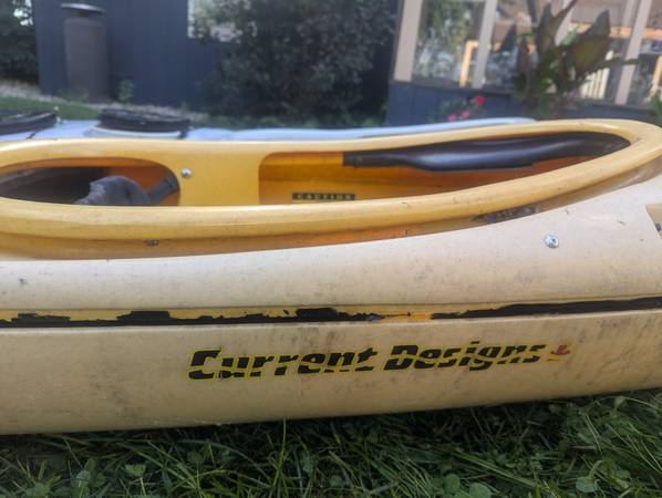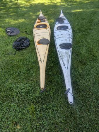Two 16' Current Design Sirocco Kayaks for sale with Skeg, back bands and 3 hatches. High performance, tight turning, quick paddle, optimized for speed and tracking on open water, rotomolded construction. Includes Cockpit Covers. Colors: Mango Orange and White. Designed by Derek Hutchinson. $1200 for the pair. $600 each.