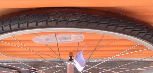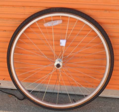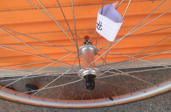 FRONT BIKE WEEL: A 700c x 42c/622-44 nylon tired front QR wheel. Silver King Kong hub, 36 3x SS spokes, aluminum alloy HJC 700c rim, SV (rim braking). White spoke reflector. Tire made in Taiwan, smooth tread w/V shaped slots. Gum wall sidewalls are weathered. Axle a little gritty but wheel runs straight and true.