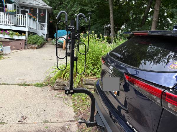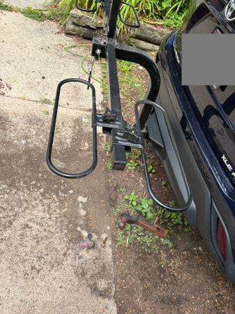 This unit fits into a standard 2" receiver hitch. The unit is currently fitted with an 1 7/8" ball. The rack will hold two bicycles. It's a bit of a lift to get them up there, but once you do they're held securely in place by a pair of padded ratcheting hold-downs. The wheel brackets fold up when not in use.