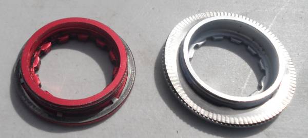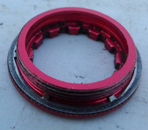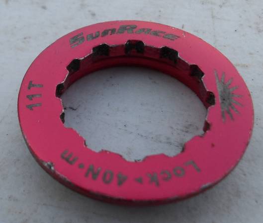 CASSETTE LOCK RING: An red anodized aluminum SunRace 11 tooth cassette lock ring. $5.