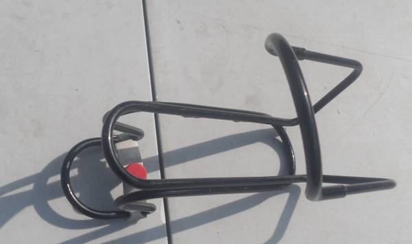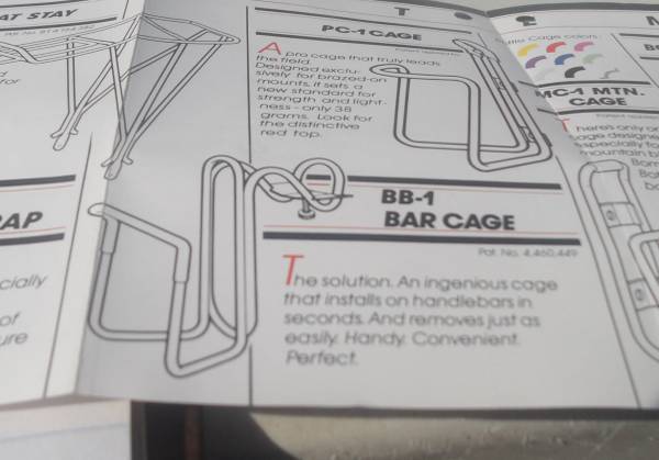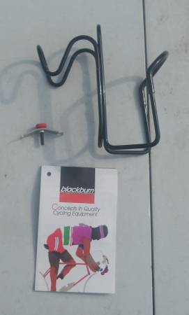 HANDLE BAR WATER BOTTLE CAGE: A Vintage Blackburn brand water bottle cage, model BB-1 Bar Cage, that fits on the bike handle bar/stem. Easy on/off to provide easy access to a water bottle while riding a bike. Like new, used only a few times. Hard to find as no longer made. Plus a FREE $5 water bottle, you pick from dozens.