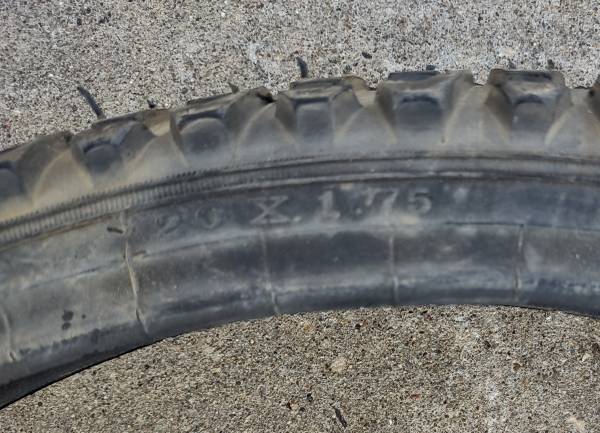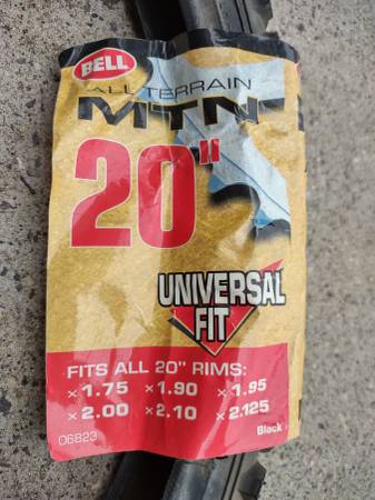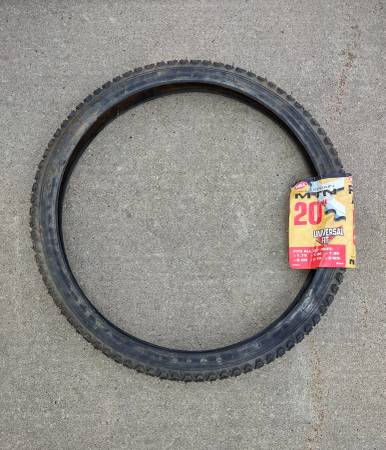 New 20 x 1.75 All Terrain bicycle tire. Fits all 20" bicycle rims. Also have a good used tube and rim strip available at no extra charge.