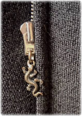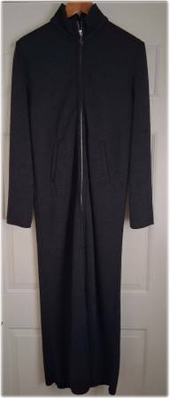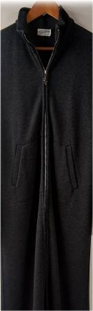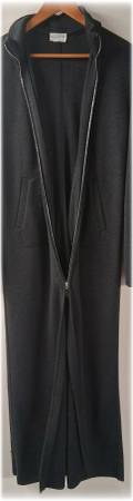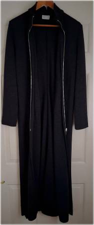 This is gorgeous dark charcoal wool knit sweater coat by Agnis B of Paris. It could also pass being a black color. It is in a size ladies large. Measurements are: 53" overall length, underarm chest 19", with 25" long sleeves. There 28" long zipper closure, two front slip pockets and a decorative back center seam.